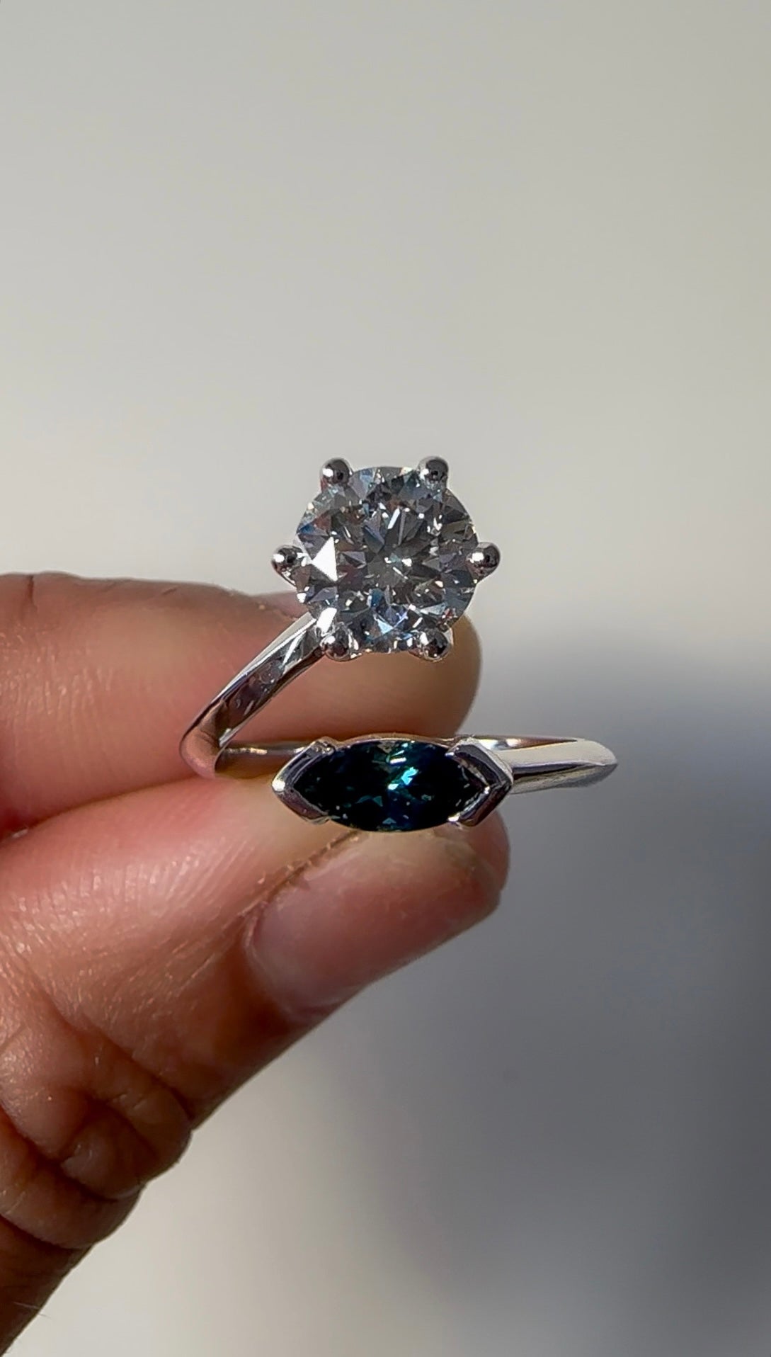 Customer wanted to re-use the diamond from their old ring to create something they could wear daily. She liked the idea of a split ring and combining the diamond with this gorgeous Australian sapphire.