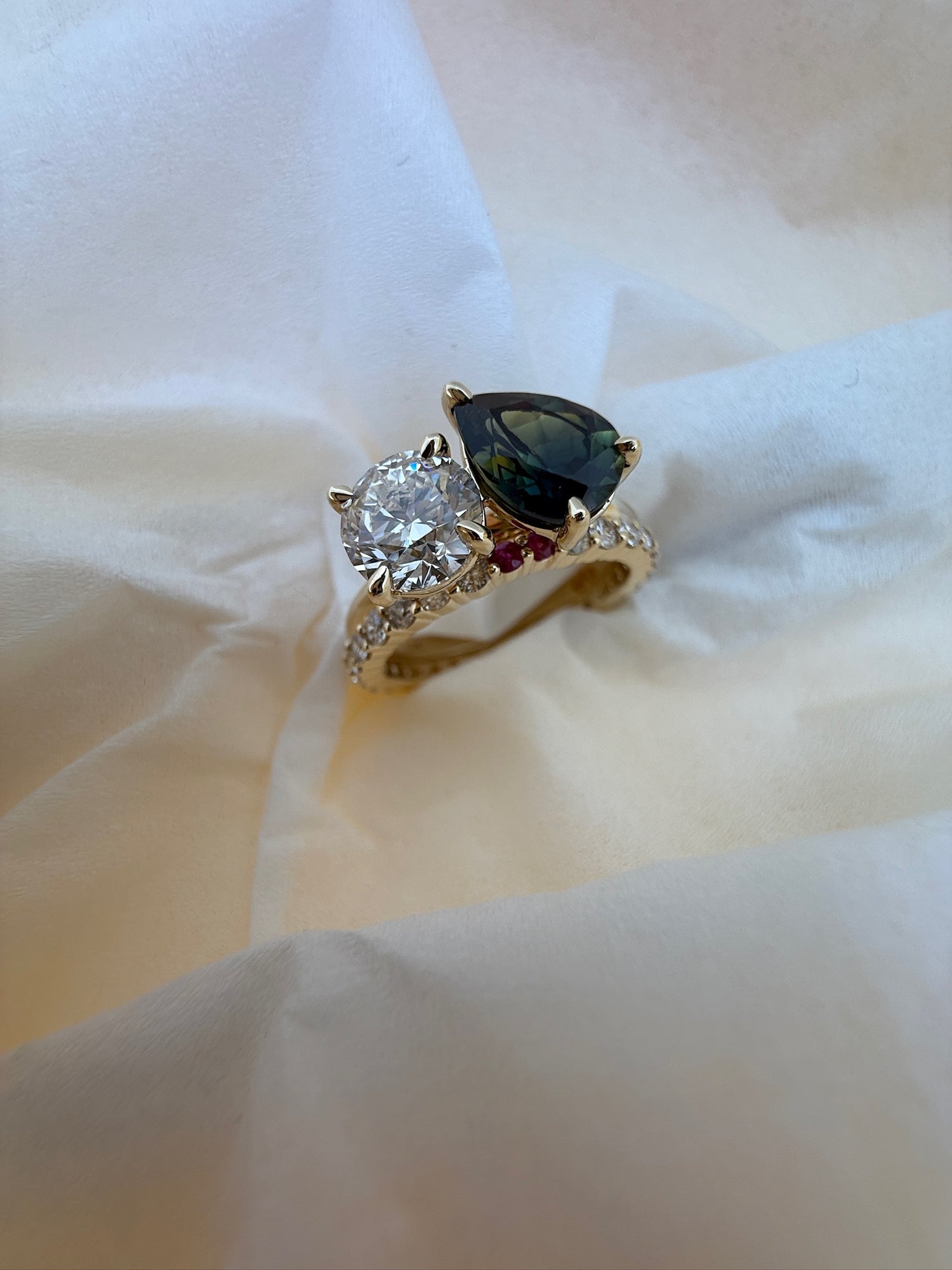 Customer wanted to create a Toi et Moi ring using the diamonds and small rubies from their old ring. They were also able to source a gorgeous Australian Sapphire to pair with it.