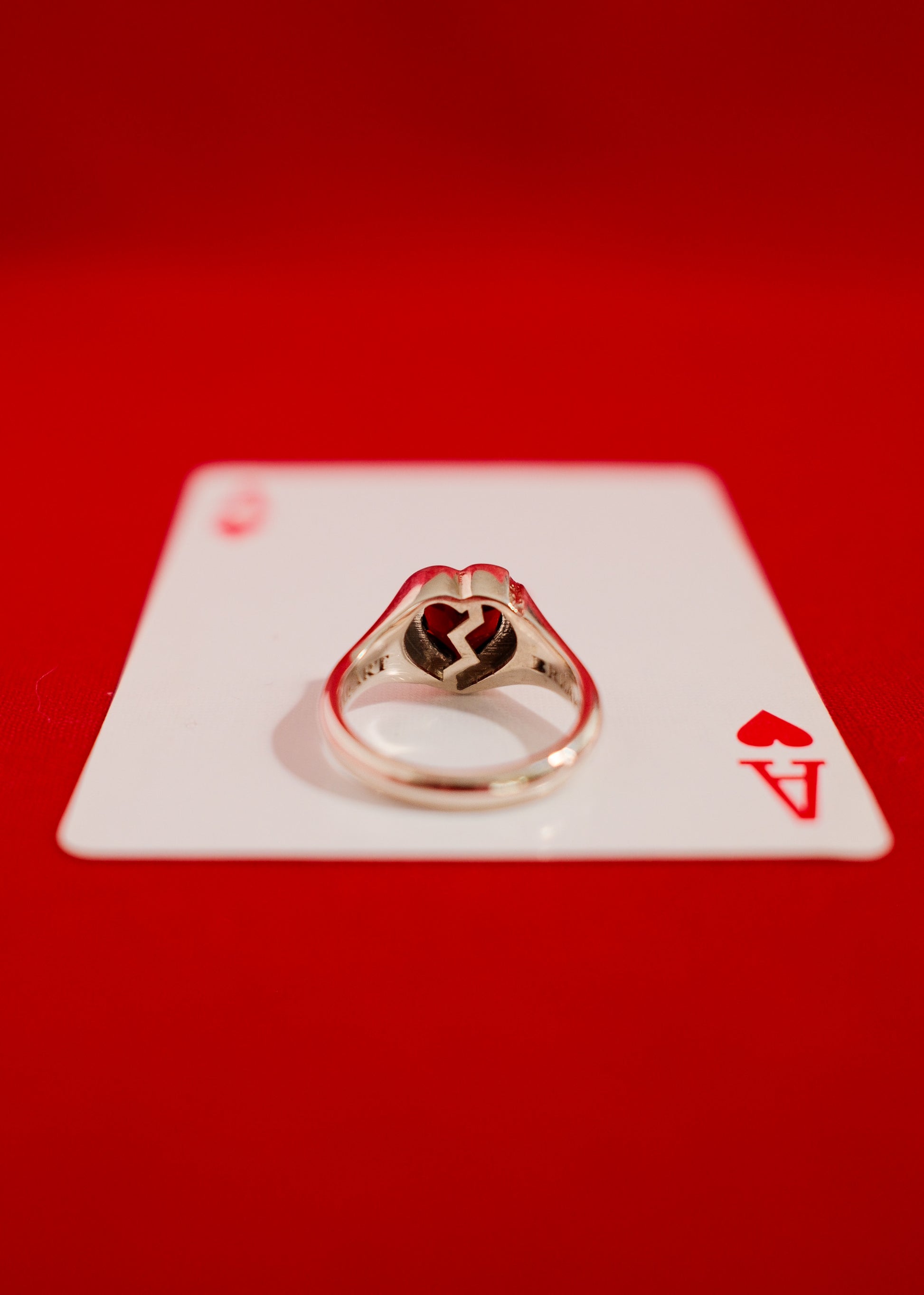 This one off solid white gold ring features a gorgeous heart cut garnet, with some unique design features that play on the 'heartbreaker' title - including the words 'heartbreaker', engraved underneath the ring