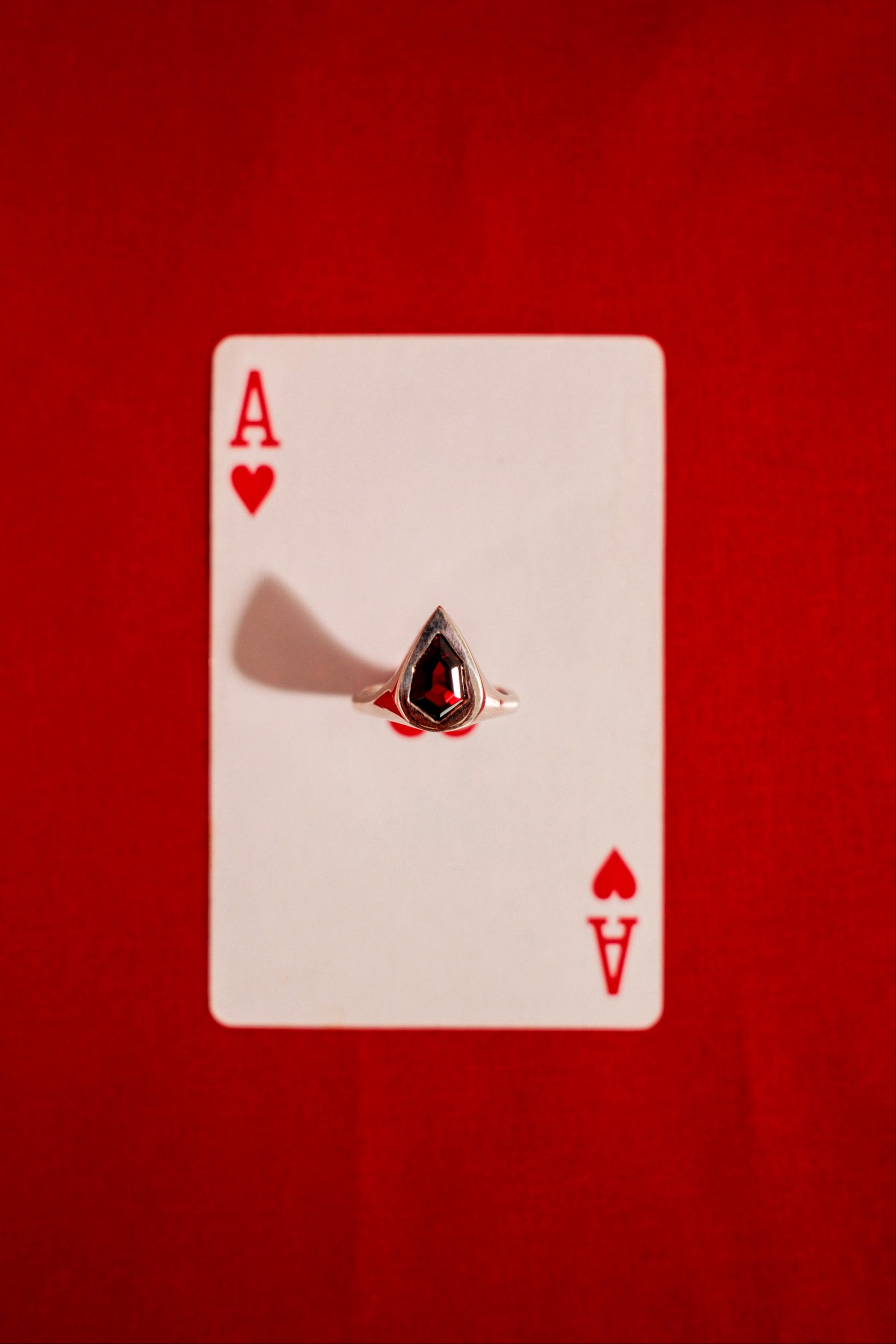 This one-off solid Palladium-Silver ring features a one-of-a-kind gypsy set garnet, set low and securely but also allowing plenty of natural light in to capture the stunning colour of this unique stone.